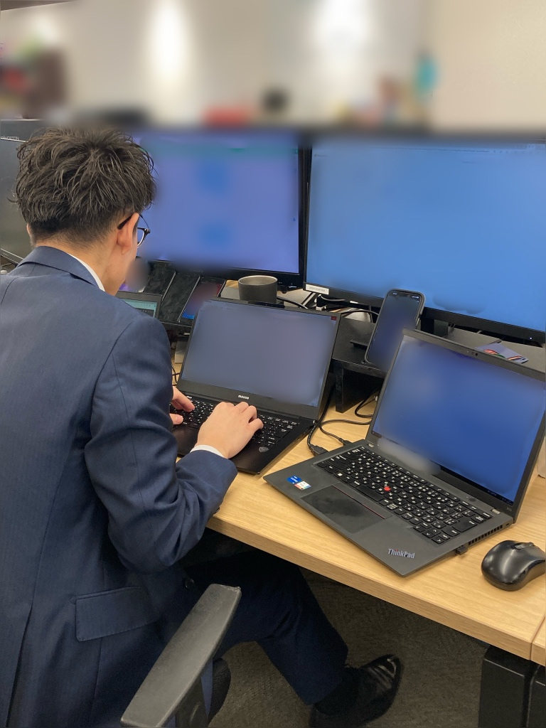 MUSUBUのTS事業部では特に外出がなければカジュアルな服装での勤務が基本ですが、石黒くんはいつもスリーピースのスーツです。その理由は、”かっこいいから”。