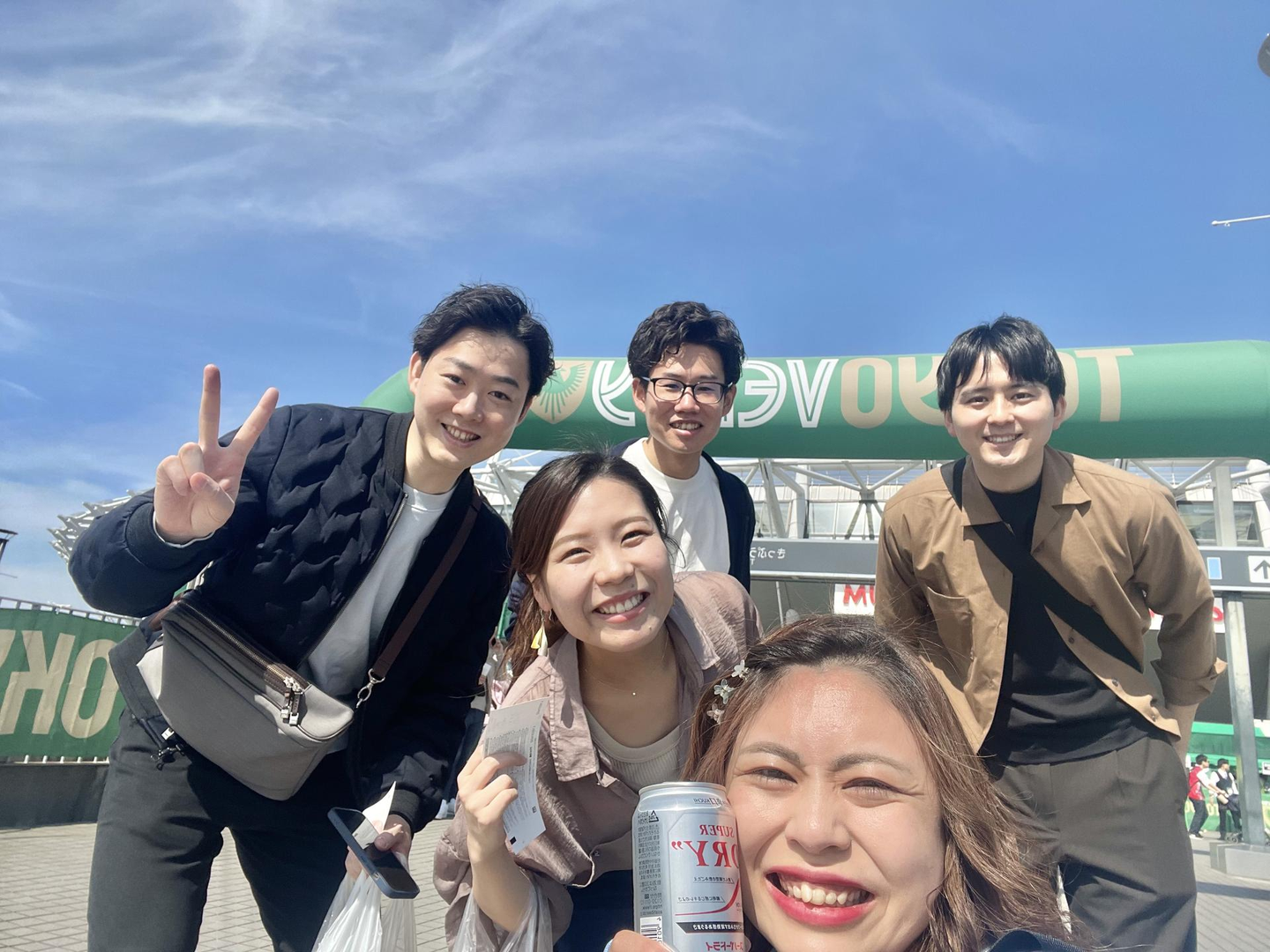 ↑左上から同じTS事業部のゆうじさん、僕、中澤さん。左下から猪飼さん、角野さん。休日にみんなでサッカーを見に行きました!