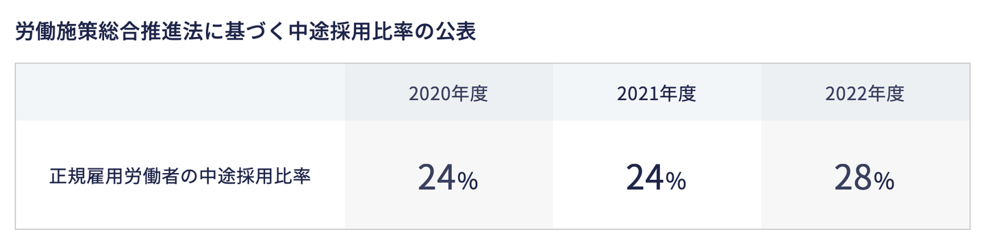 労働施策総合推進法に基づく正規雇用労働者の中途採用比率は2022年度に28%となりました。
