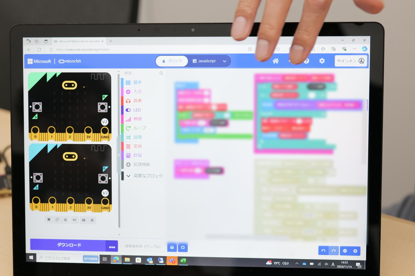 今回の授業では、「MakeCode」というMicrosoft社のツールを使用し、ブロックを組み合わせてプログラムを作成。たとえば「もし~ならば」といった条件設定やループ処理など、プログラムの基本的な構造をブロックで表現できます。授業の中で全てのプログラムをつくるのは難しいので、一部を穴埋めする形式にしました。