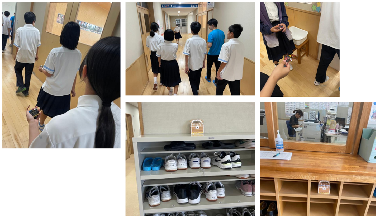 菱沼:まずプログラムをつくってもらった後、実際にそのプログラムを使って宝探しゲームをする流れで実施しました。生徒1人に1台ずつマイクロビットを配布し、4人1組のグループで学校内に隠された宝を探してもらいました。