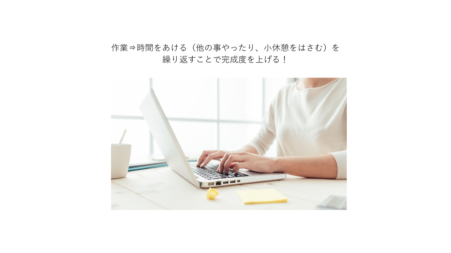 資料作成時間を長時間とるよりは、作業⇒時間をあける(他の事やったり、小休憩をはさむ)を繰り返すことで完成度を上げていきます。