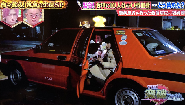 話としては、患者の様態が急変。 連絡を受けた奥さんがタクシーで病院に駆けつけるものの、血液が不足している。 そこで担当医であった意思が、奥さんの乗ってきたタクシーの乗務員に無線で都内を走っているタクシー乗務員に輸血協力のお願いをしたところ10台以上のタクシーが集まり難を逃れたってお話。 奥さんが駆けつけるシーンのタクシーがまず弊社。