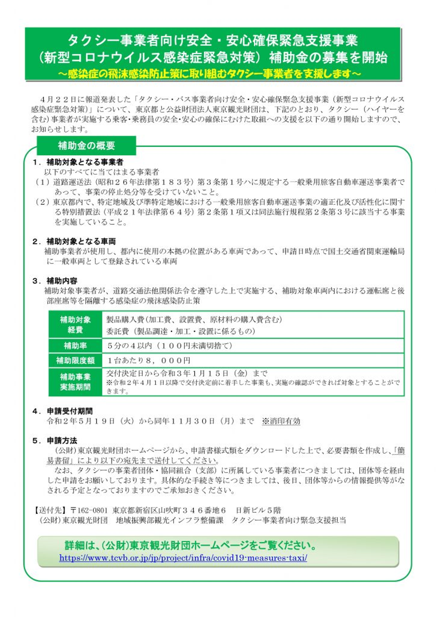 「タクシー・バス事業者向け安全・安心確保緊急支援事業(新型コロナウイルス感染症緊急対策)」について、東京都と公益財団法人東京観光財団は、タクシー(ハイヤーを含む)事業者が実施する乗客・乗務員の安全・安心の確保にむけた取組への支援いたします。