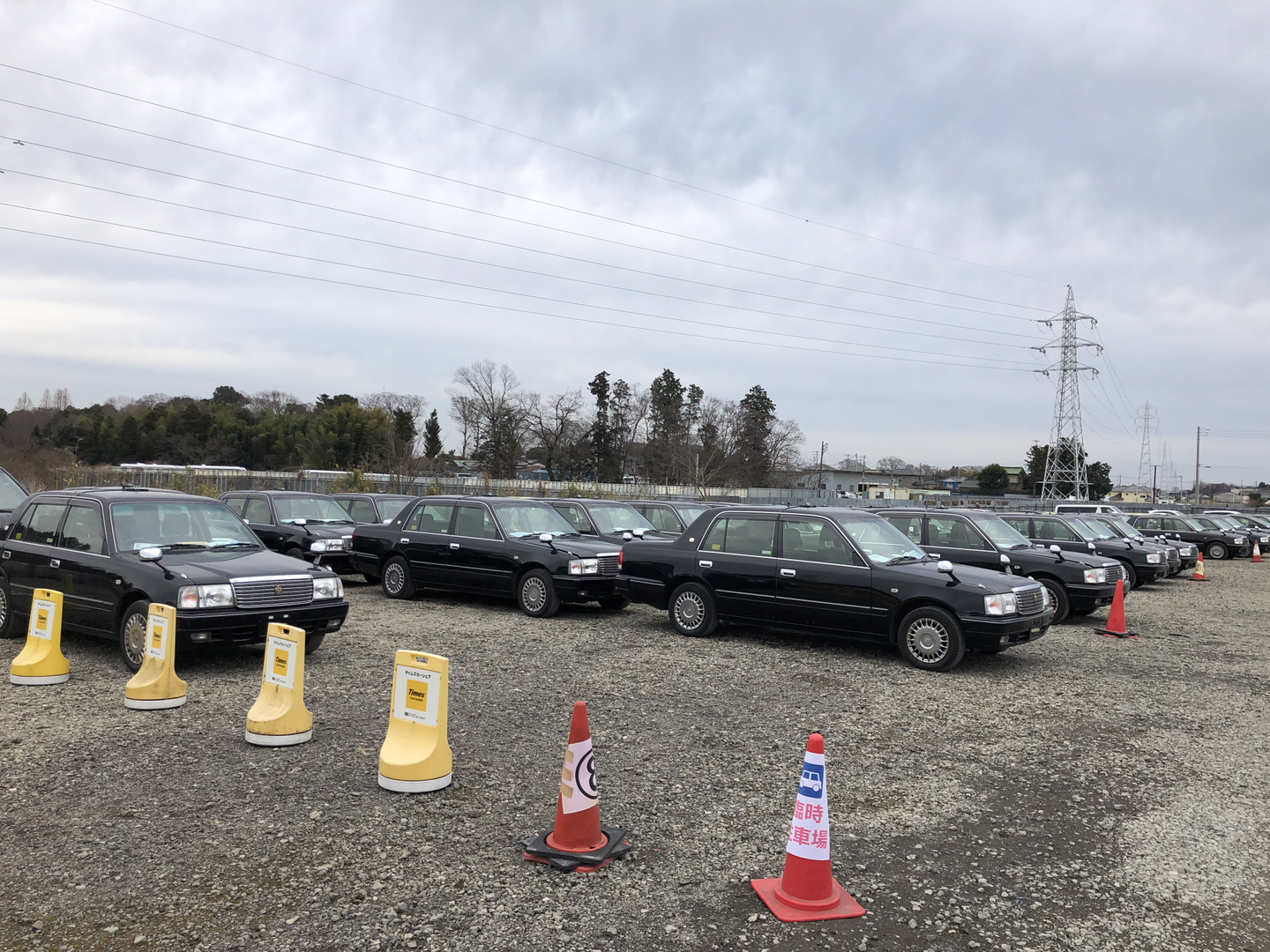 広ーい駐車場に70台以上のタクシーが並べられています。