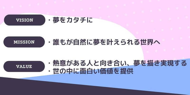 昨年12月にMVVを策定したのですが、世の中に「誰もが自然に夢を叶えられる世界」をミッションに掲げているからには、まず自分が「夢を叶える」ことが大前提ありますよね。