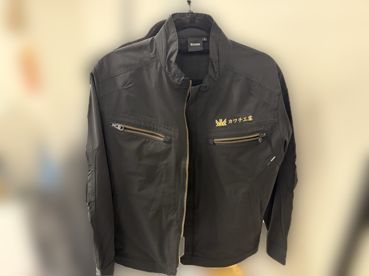 カワチ工業では前進黒のユニフォームを貸与。現場で着用していただきます。