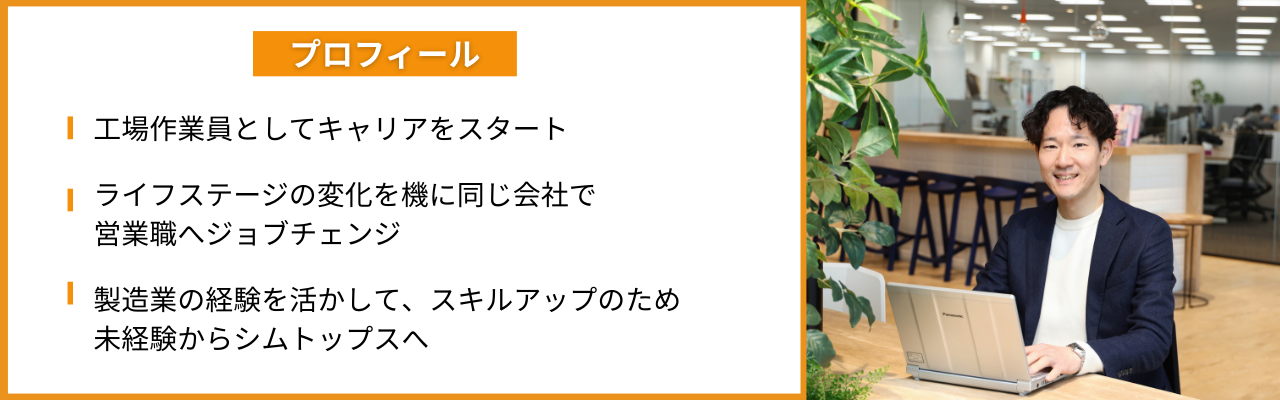 今までのキャリアをゼロにしての転職は難しいと考え、製造業での経験を活かすことができて、営業としてもスキルアップが目指せる環境を求めて転職活動を始め、そこで出会ったのがシムトップスです。