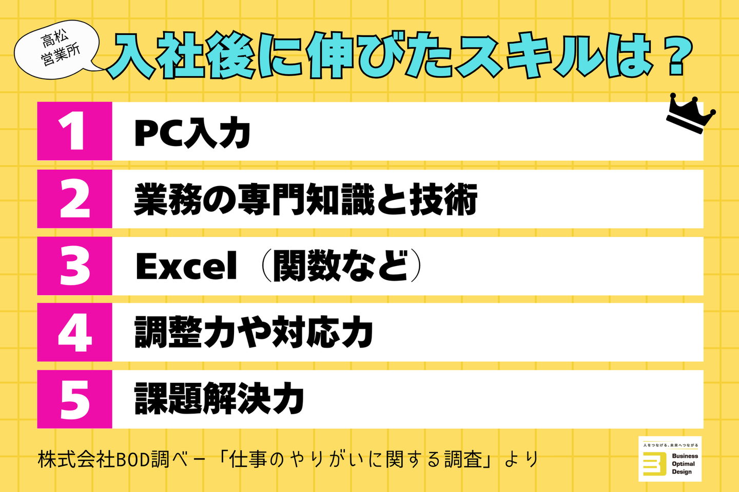 向上したスキル:入社後に最も伸びたスキルとして、過半数が「PC入力」と回答し、次いで2位は「業務の専門知識・技術」、3位には「Excel(関数など)」との回答が集まりました。全体として、PC関連のスキルが上達したと回答した方は全体の75%を占めており、アウトソーシングサービスを提供するBOD高松営業所の強みが反映された結果となりました。