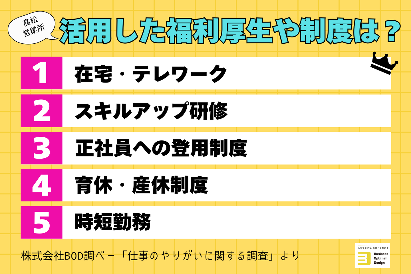 コロナ禍の際に、多くの従業員が「在宅・テレワーク」制度を利用していたことがわかりました。また、研修制度も活用度が高く、MOSエキスパート研修やITパスポート研修などを受けていることがわかりました。「産休・育休」制度の取得率は100%であり、「時短勤務」制度も有効に活用されていることがわかりました。また、研修制度を活用してスキルを向上させた従業員も多く、高松営業所の専門性の向上やキャリアパスの充実にもつながっていると考えます。