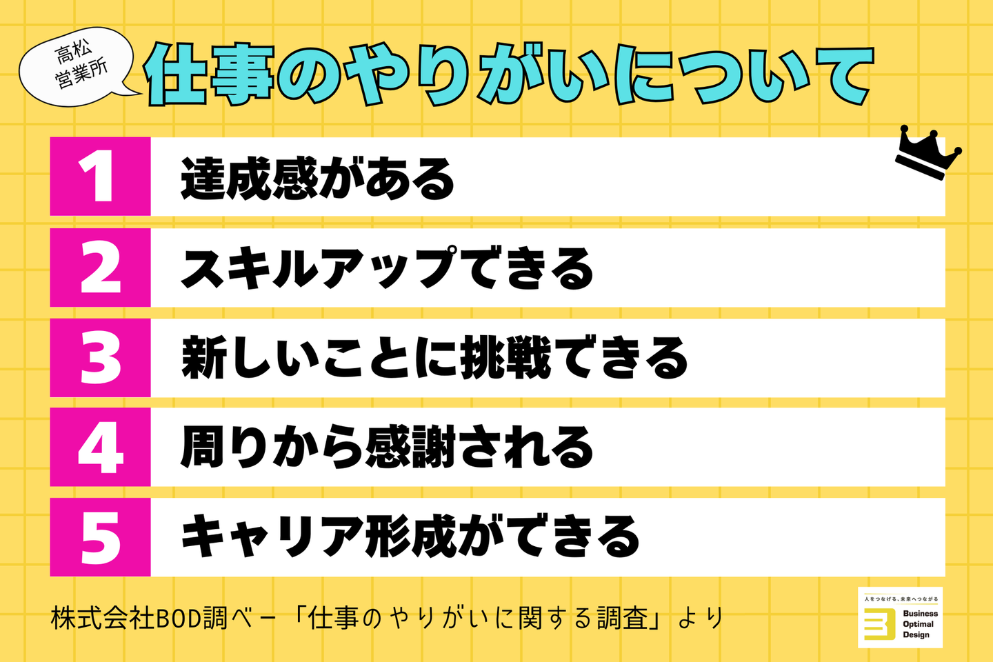 仕事のやりがい:最も多くの従業員が「達成感がある仕事」にやりがいを感じると回答しています。次いで、「スキルアップができる仕事」と回答した人の中には、BODの研修制度を利用している人も多数いることがわかりました。