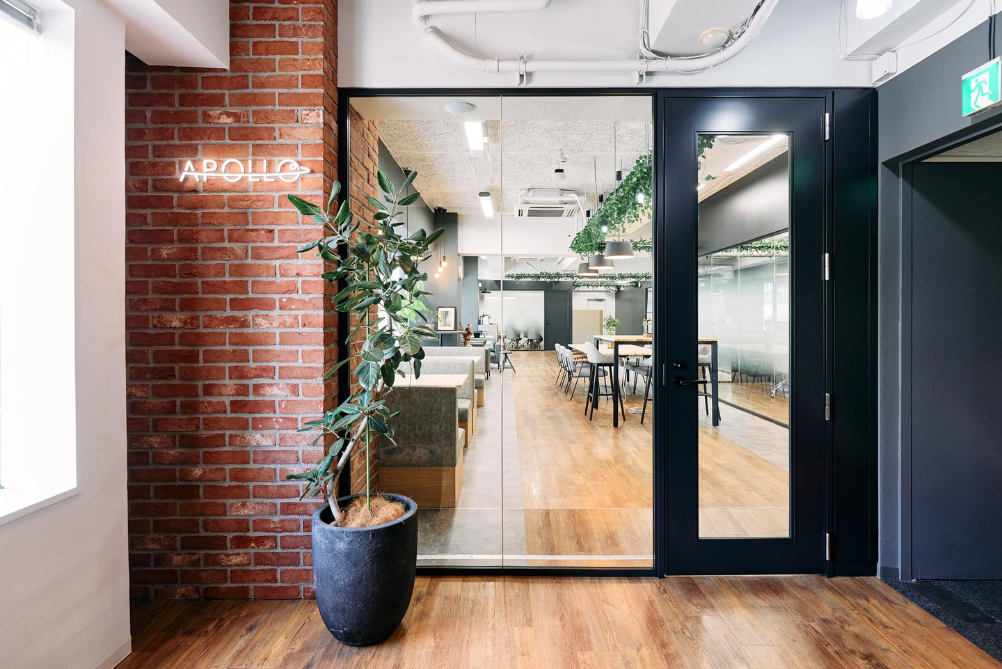APOLLOロゴのネオン管が掛けられていてお洒落かつ、大きなガラスで中が見えるのが開放的な印象を与えてくれます。