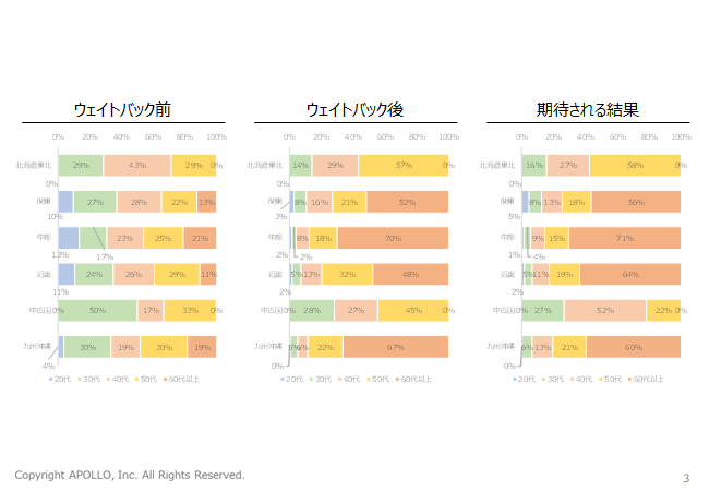 ウェイトバック集計を用いることによって、保有しているデータをより確からしい分布に修正して適切な集計・分析を行うことができます。