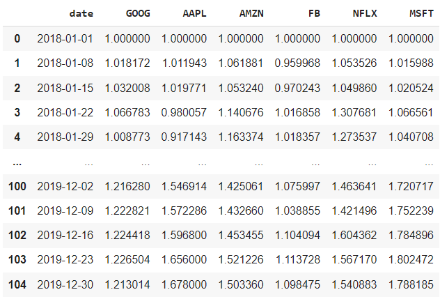 2018年から2019年までのGoogle、Apple、Amazon、Facebook、Netflix、Microsoftの相対株価(2018年1月1日を1とした値)を週次で格納しています。データの中身は以下のようになっています。