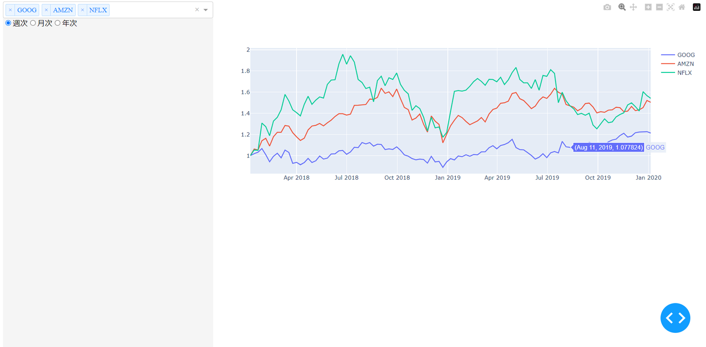 今回はドロップダウンリストを使って株価を表示する企業、ラジオボタンを使って時系列粒度を変更できるようにします。ドロップダウンリストとはたくさんの選択肢の中からいくつか選ぶタイプのメニューバーで選択肢が増えても場所をとらずに表示できます。ラジオボタンは複数の選択肢から一つだけ選ぶタイプのメニューバーです。