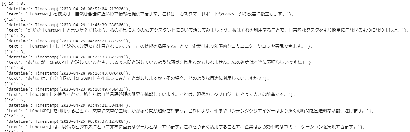 ChatGPTに「ChatGPT」という単語を含んだダミーツイートを100個考えてもらい使用しました。投稿日時は2023年4月23日~2023年4月30日までの間でランダムに生成したものを使用ました。