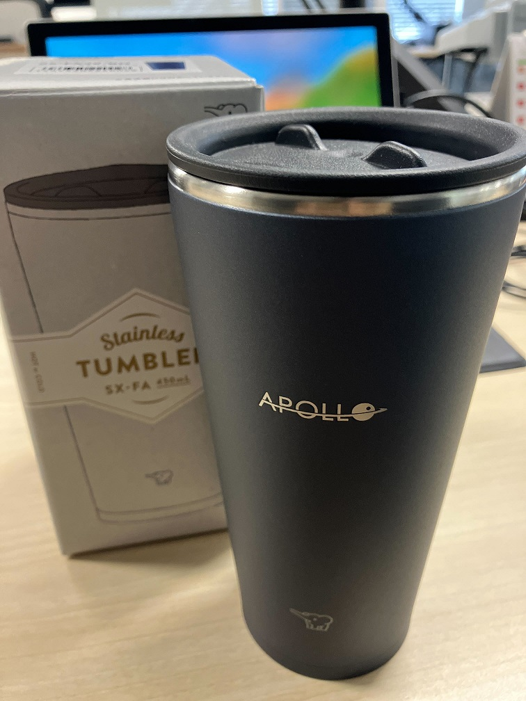入社周年記念は、1年目記念にロゴ入りタンブラーです。オリジナルタンブラーです!