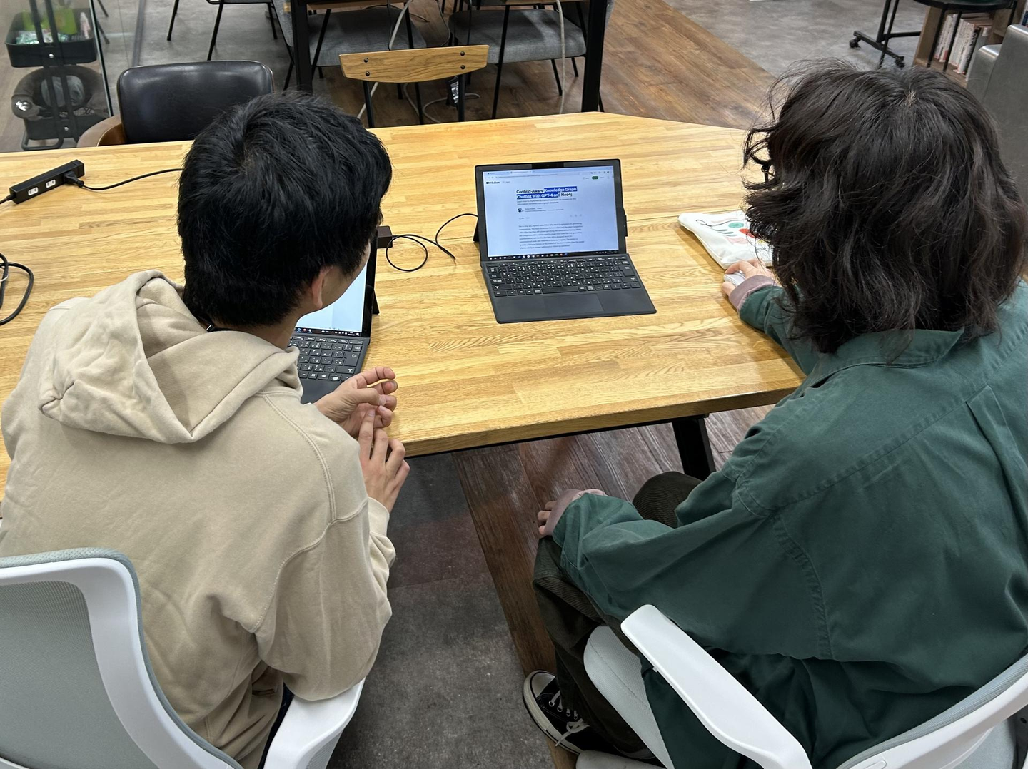 フリーアドレス制を取り入れている当社ですが、指導担当者と実習生が毎日隣同士で座ることも。