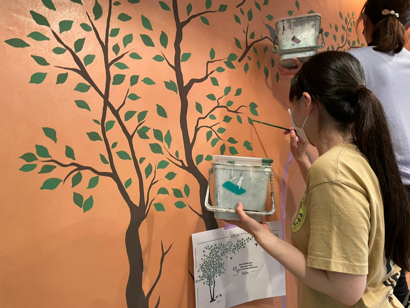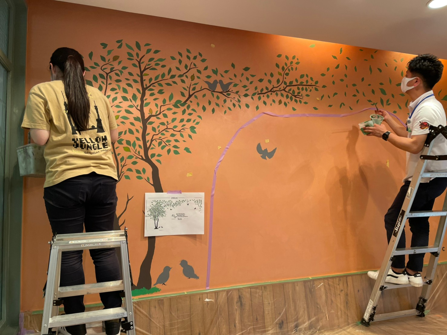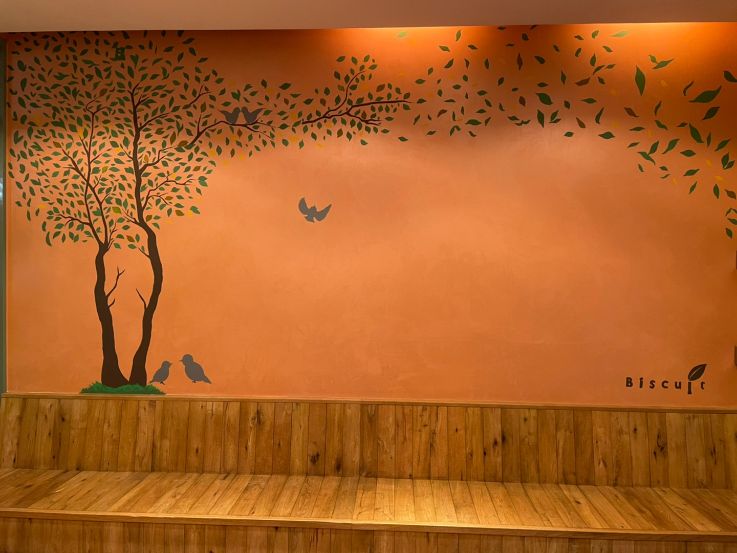 そこで自然が多い立地とオレンジの壁に合うように、木を基調とした絵を見本として提案したんです。見本を見て、ビスキュイ様が無事OKを下さったので、塗装工事が終わった数日後に、お店に直接伺って描きました。
