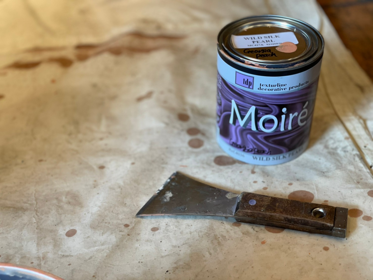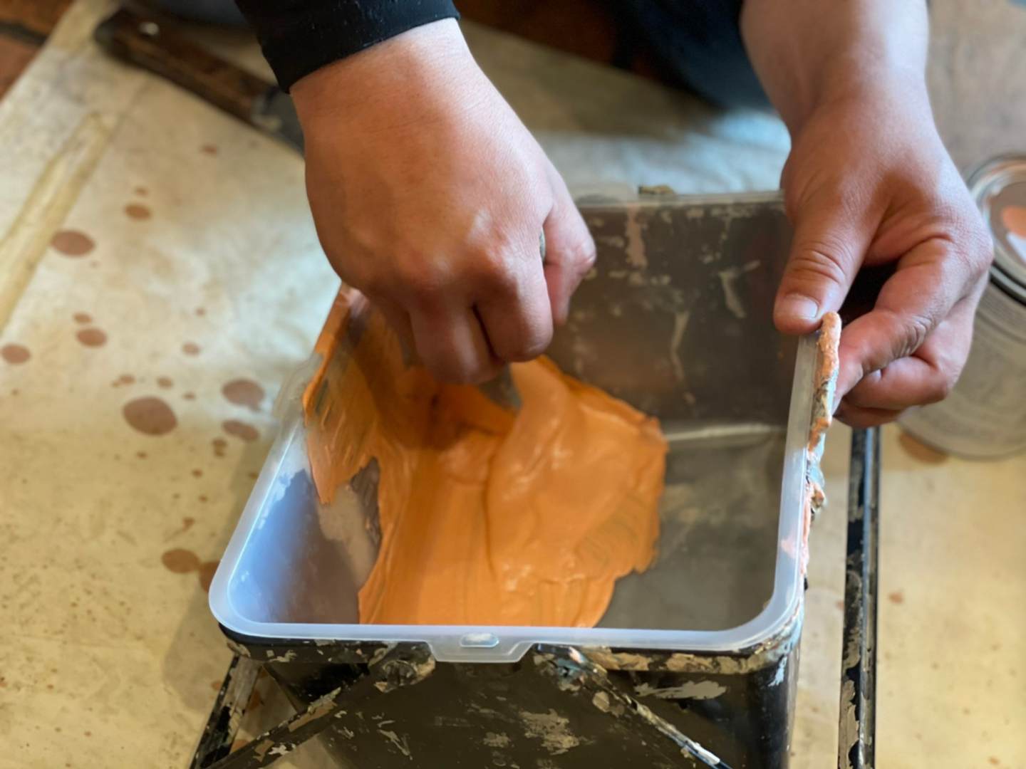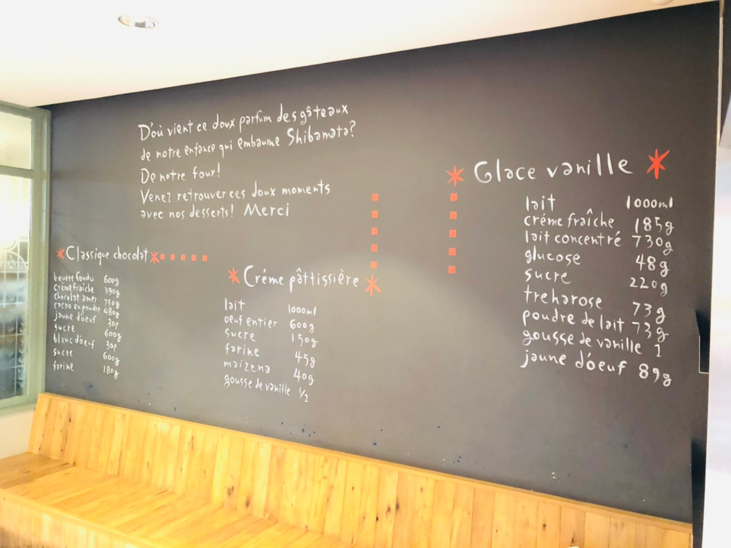 ビスキュイ様のお店の周りには、たくさん木が生えています。また今回の工事では、もともとは黒板にチョークでレシピを書いていた壁を、モアレという特殊な塗装をして、少し艶感のあるオレンジ色の壁へ塗り替える予定でした。
