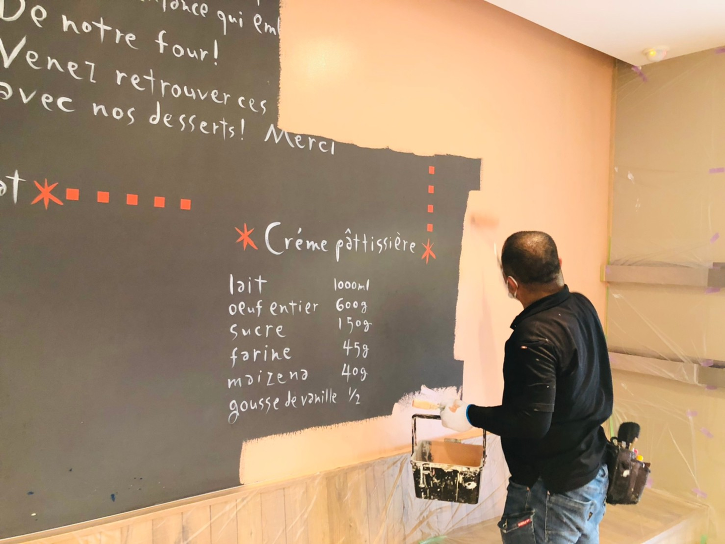 小沢さん:葛飾区のお菓子屋さん「ビスキュイ」様の内装工事の一環で、オリジナルの絵を描くという企画です。今回は、ビスキュイ様のお客様がお食事を楽しんだり、くつろいだりするカフェスペースの内装工事のご依頼をいただていました。