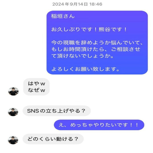 bfj代表の稲垣とのDMで「やりたい事あって今のままでは叶わないのであれば、辞めて、bfjに来なよ!」と話してくれた事も大きいです。