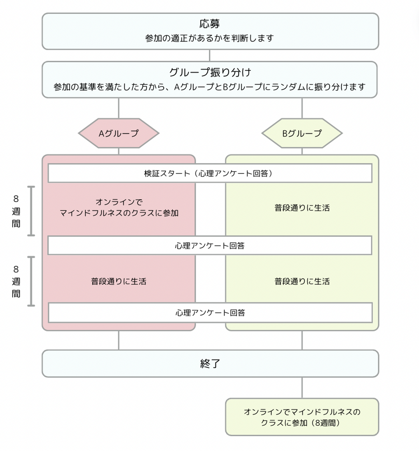 本研究では、乳がんの術後、無再発の患者100名を対象に8週間マインドフルネスのクラスに参加する介入群と、8週間通常通りの生活をおくる対象群に振り分けを行うランダム化比較試験を行った結果、介入群に統計学的に有意差をもって不安・抑うつスコアの改善が認められました。