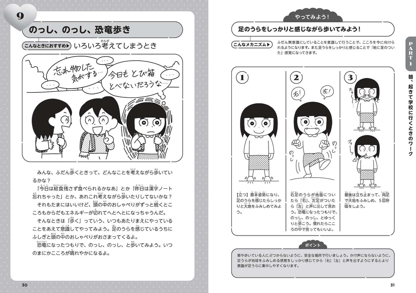 起きてから学校に行くまで、授業、放課後、寝る前など、1日のさまざまなタイミングに合わせたワークが収録されており、イラストとやさしい言葉で構成された内容は、子どもはもちろん大人にも日常で役立つヒントが満載です。