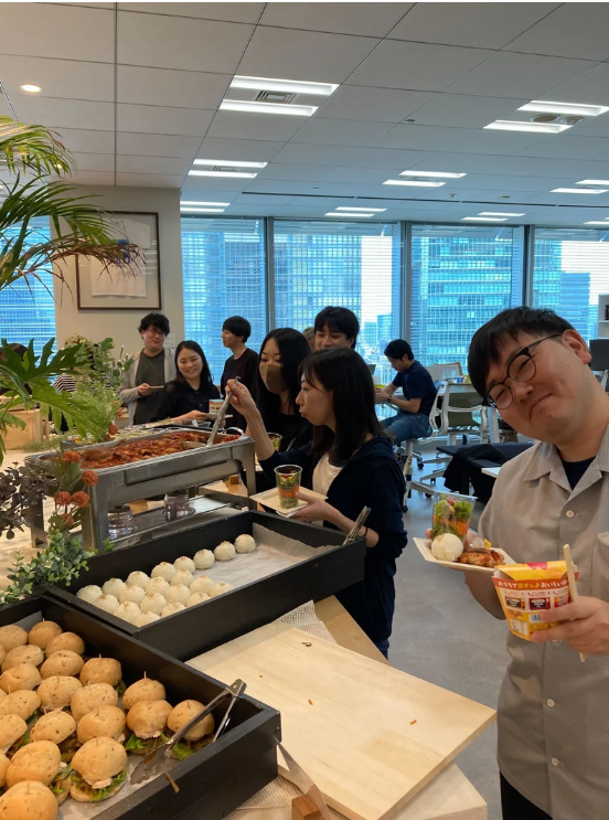 私たちの会社では毎週水曜日の13時から、福利厚生の一環でランチビュッフェを開催しています。食事を楽しみながら、メンバーと一緒にリラックスした時間を過ごせるので大好評です。