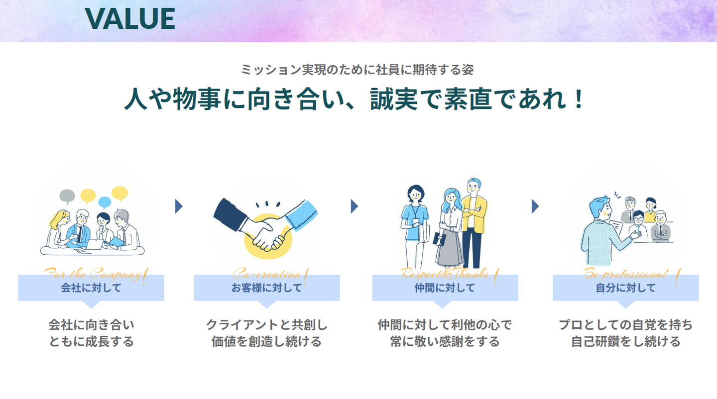 バリューとは会社が掲げるのミッション実現のために、社員に期待する姿を意味します。