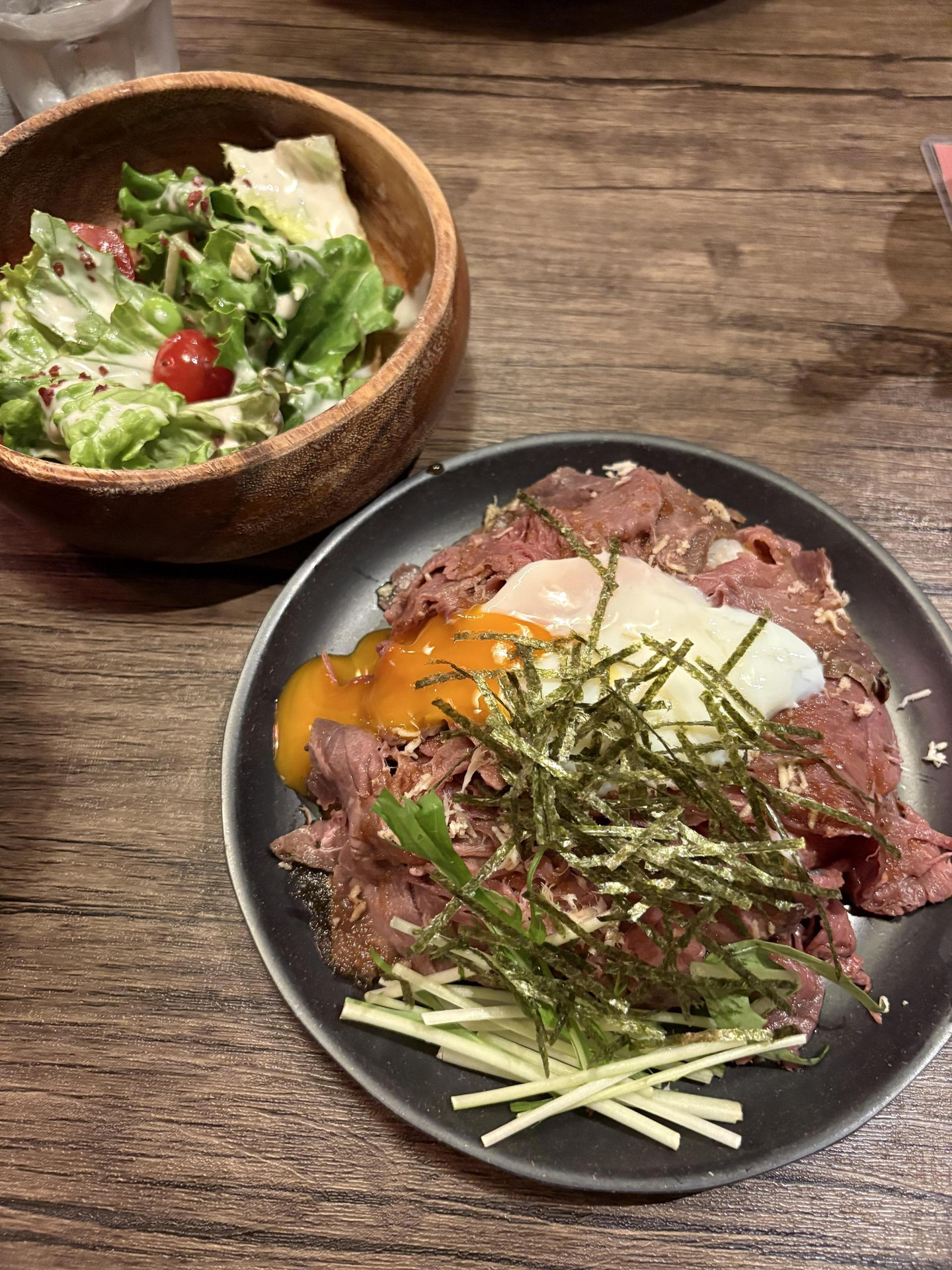 ローストビーフ丼です!タレが醤油タレとねぎ塩と選べて、今回は醤油タレにしました!