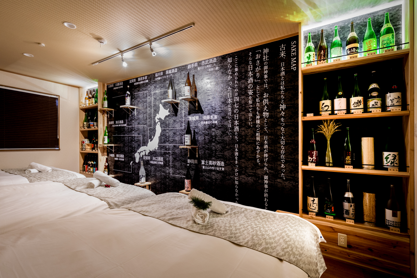 またベッドルームには日本各地の有名な日本酒を紹介する壁を作ったりと遊びゴコロ満載の施設となっています。