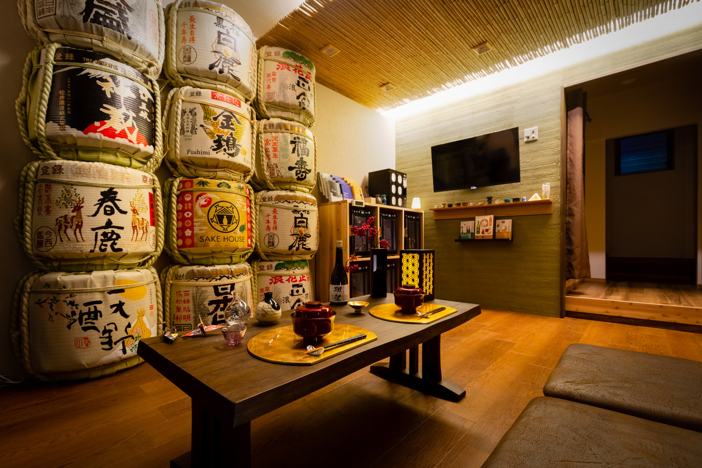 たとえば、こちらの物件は日本酒をコンセプトにしたSAKEHOUSE。日本酒の味の豊かさを4系統の日本酒やそれぞれに最適なおつまみ、様々な"おちょこ"で伝えます。日本酒って、同じものでも"おちょこ"次第で味が変わるんですよ!奥深い!宿泊施設として過ごしやすさはもちろん、コンセプトである日本酒に興味を持ってもらうことを意識して酒樽を壁にディスプレイしました!