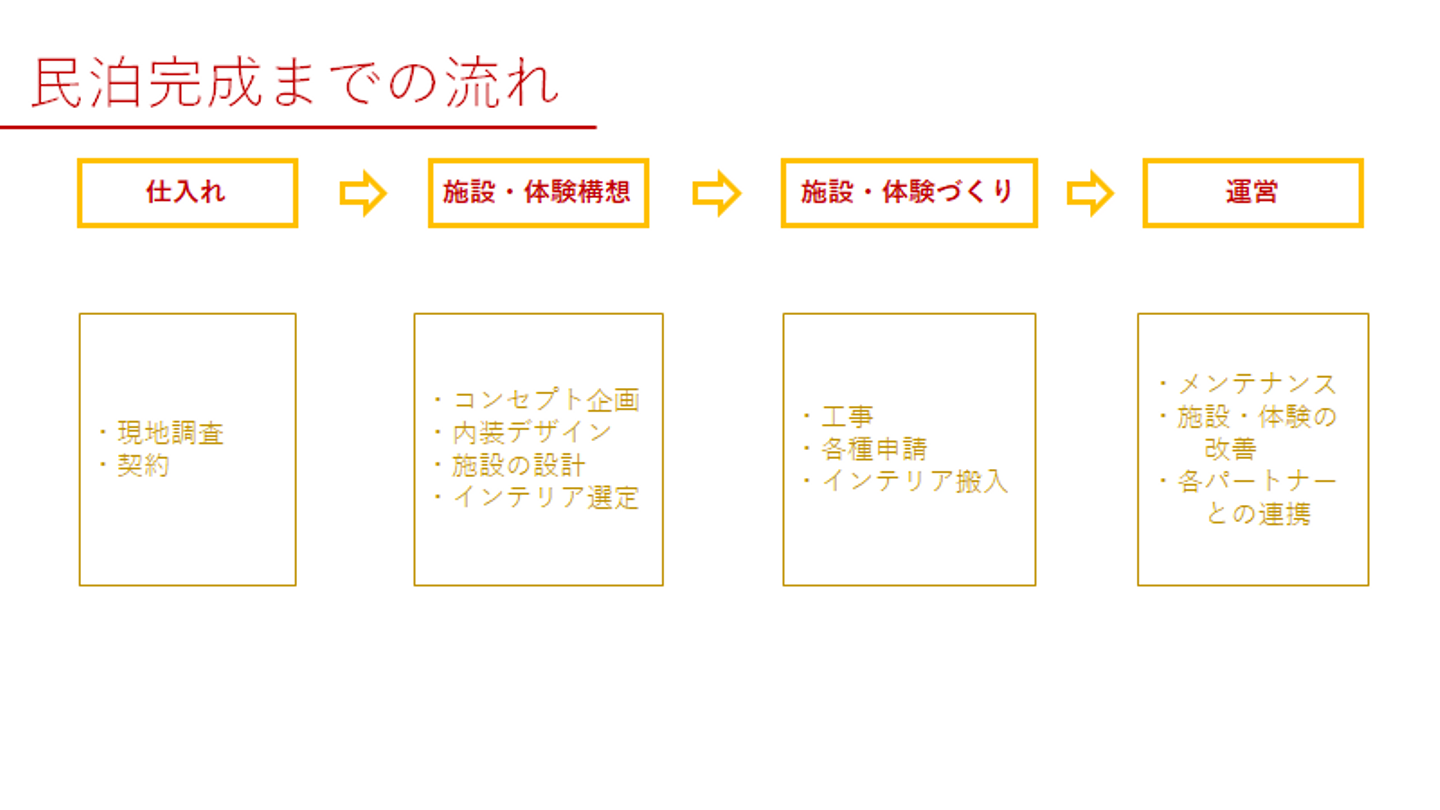 次に、物件のコンセプトとなる「伝える魅力」を決め、その為に必要な・望ましい体験や内装を考えます。そのあと工事や家具の搬入、消防関連などの各種申請を行い、予約サイトに掲載してオープン。魅力決めやオープン後のメンテナンス、改善はインターン生が主体となって取り組んでいます!