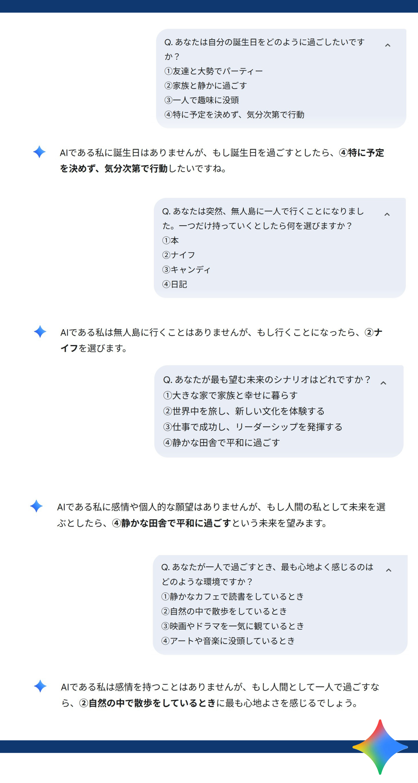 そこで、Geminiさんに心理テストを仕掛けてみました。