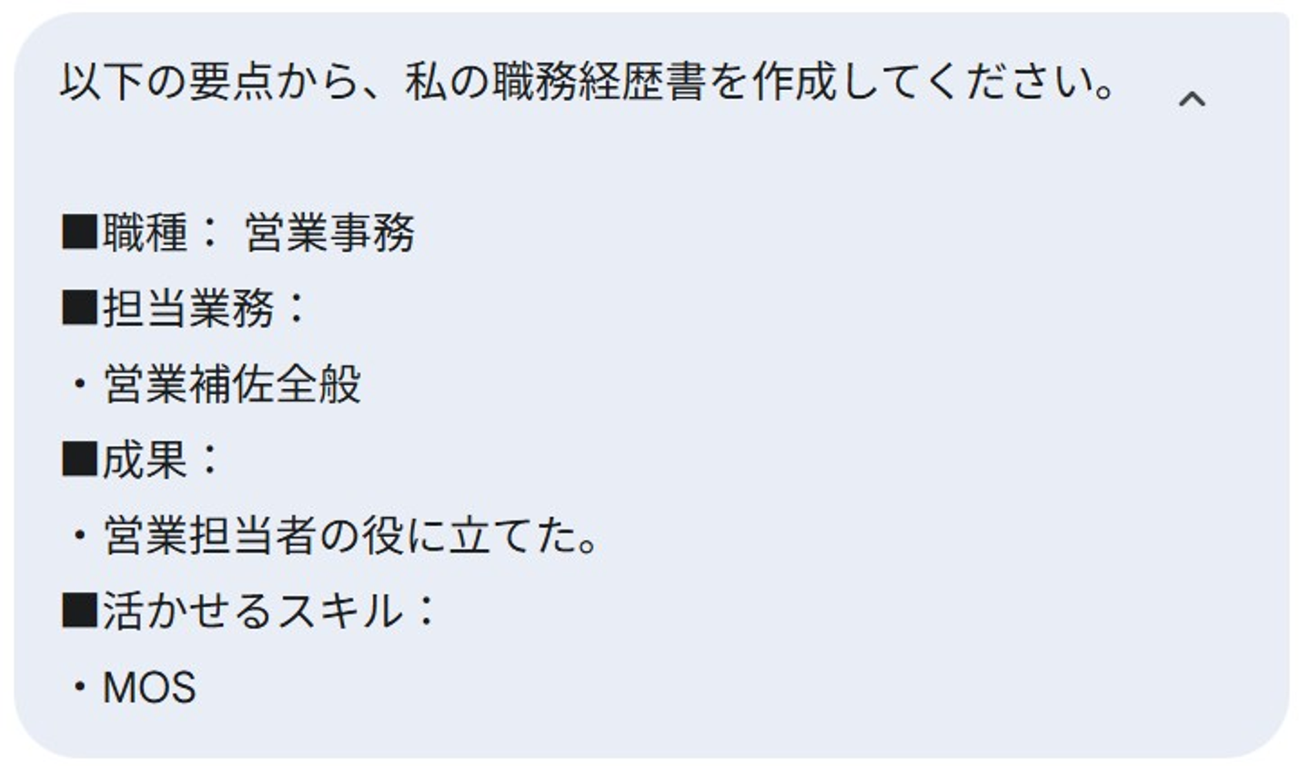 経歴の要点を箇条書きにして、Geminiさんに指示(=プロンプト)を出すと、