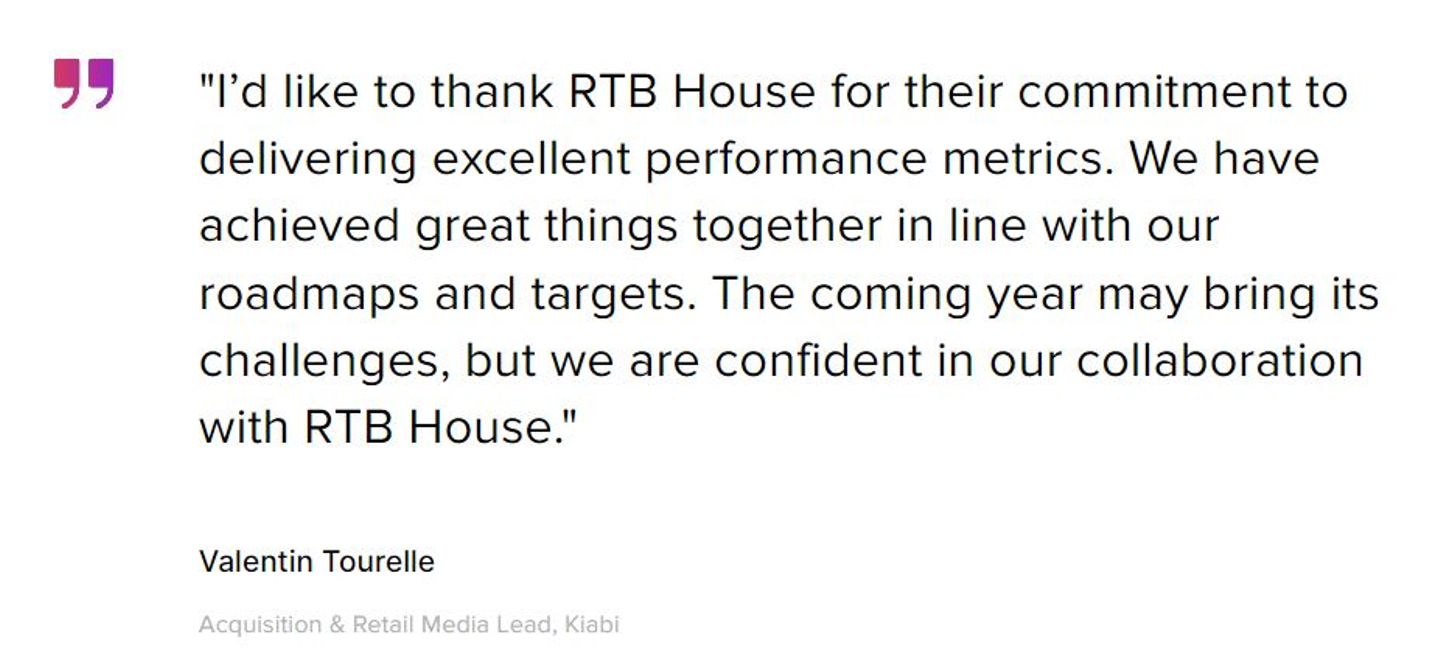 RTB House brought its significant expertise in fashion and a dedicated team to set up a retargeting campaign with a winning ensemble of creatives proven to drive results. As Kiabi sells its own products, as well as those of third-party vendors through a marketplace model, we ran two distinct campaigns. RTB House helped Kiabi to drive conversions without overlooking the retention of valuable existing ones, always making sure that this was achieved through brand-safe placements. Thanks to our Deep Learning-powered technology, engaged users who see our banners convert more frequently, and have a higher average order value. Thus we were able to reach Kiabi’s performance targets swiftly.
