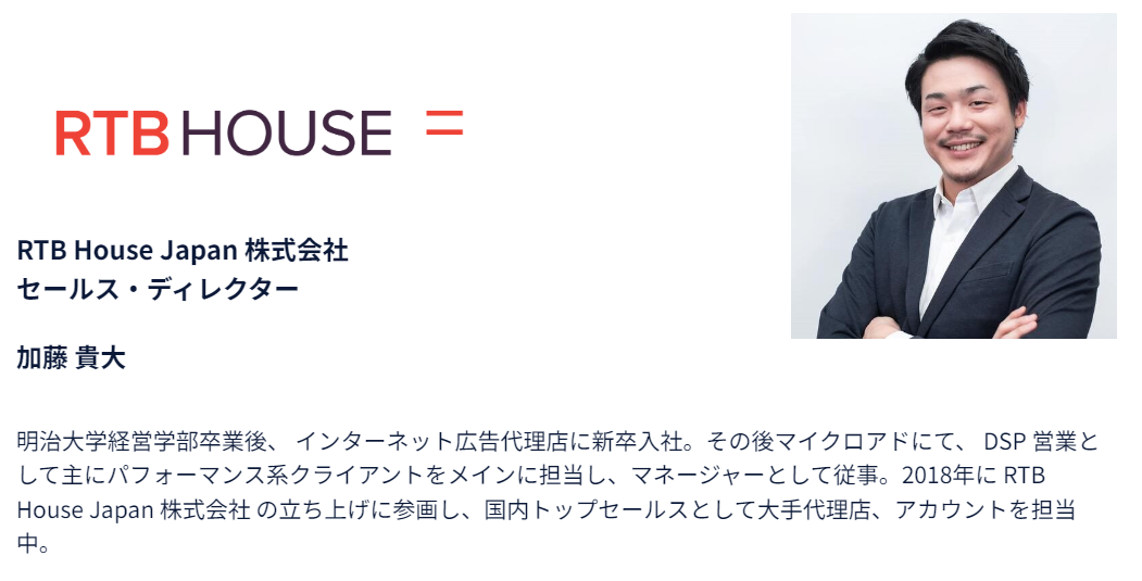 RTB House Japan 株式会社はポーランド・ワルシャワに本社を置き、 AI ディープラーニング(深層学習)に基づいた世界初の広告入札エンジンを独自開発し、世界中の企業及び代理店に広告配信を提供しています。 本セミナーでは RTB House Japan 株式会社の根幹技術であるディープラーニング(深層学習)エンジンをもとに、リターゲティング配信についての考え方を事例とともに紹介します。