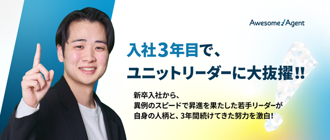 オーサムエージェントは、年次に関係なく、実力に応じた評価をする環境を提供しています。実際に、新卒入社からわずか約1年半で役職に就いたメンバーもおります。成果を出せば若手にも積極的に裁量を任せるため、いち早く成長したいと考える方には非常に適した環境です。