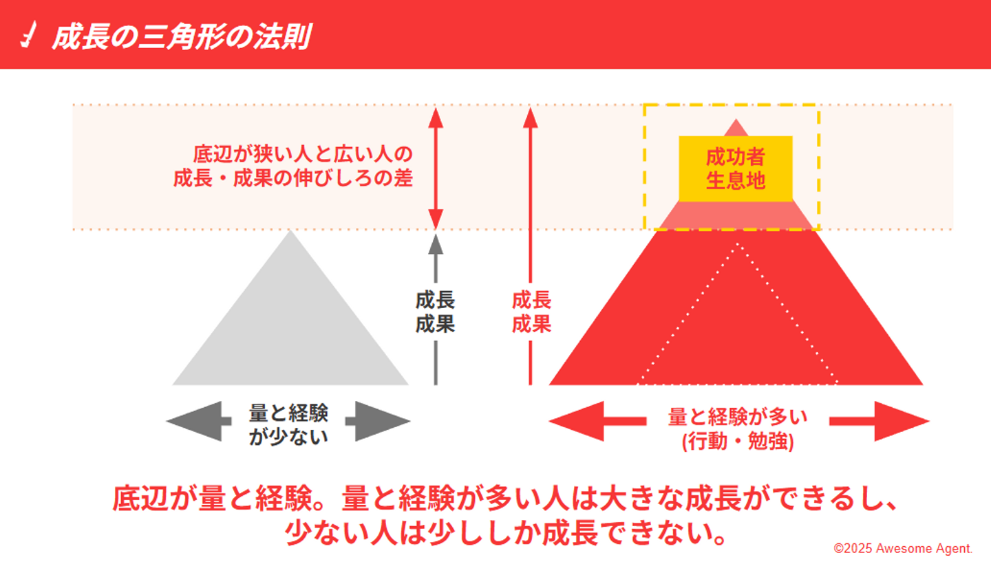 成長・成果の伸びしろを表現する方法として「成長の三角形の法則」という考え方があります。行動の量と経験を三角形の底辺とした場合、量と経験が少なければ三角形は小さくなってしまうでしょう。それに比べて、その底辺となる行動量と経験が多ければ多いほど、出来上がる三角形も大きいですよね。自分が目指す社会人へと急成長するためには、入社する会社がどれだけ”行動の量”と”経験”を増やせる環境なのか。それを見極めなければいけません。