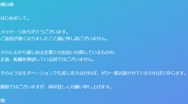 実は、先ほどのスカウトメールの受信からすでに1ヶ月近く経っていました。