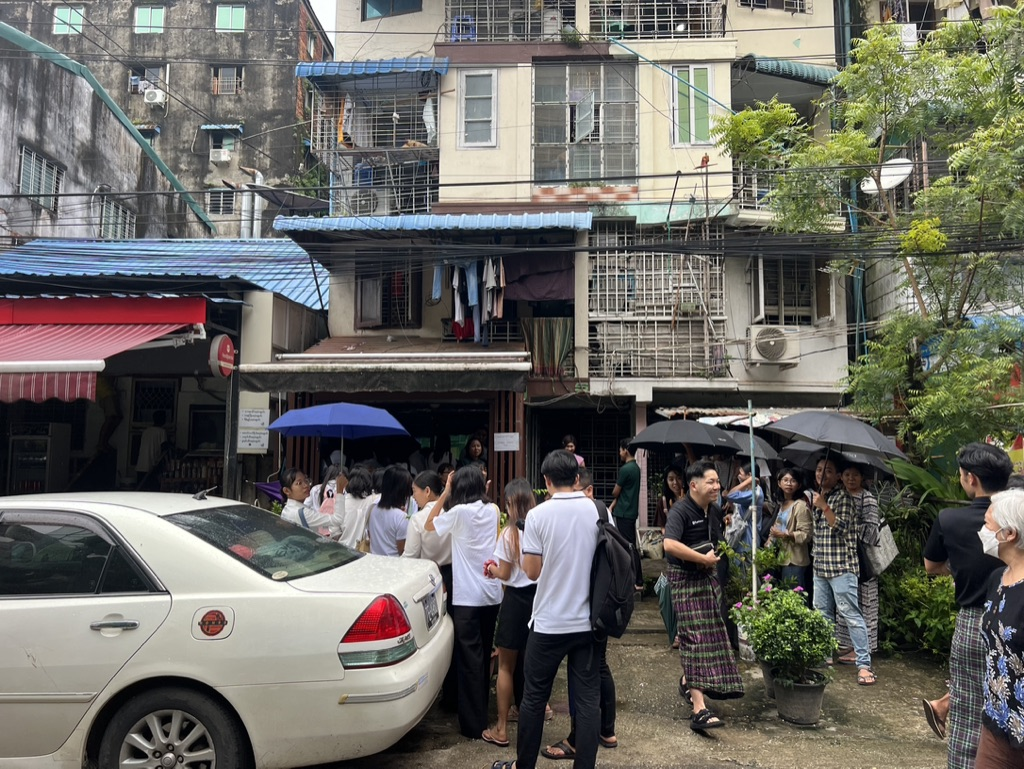 ヤンゴン市外にある日本語学校で、学校へ向かう道は車1台がやっと通れるような場所。雨で道は冠水しているし、決して綺麗な環境とは言えないところです。