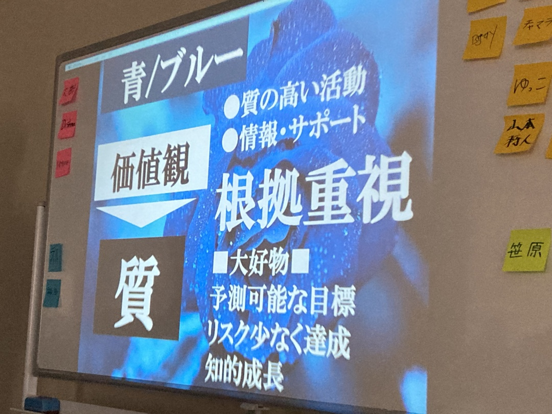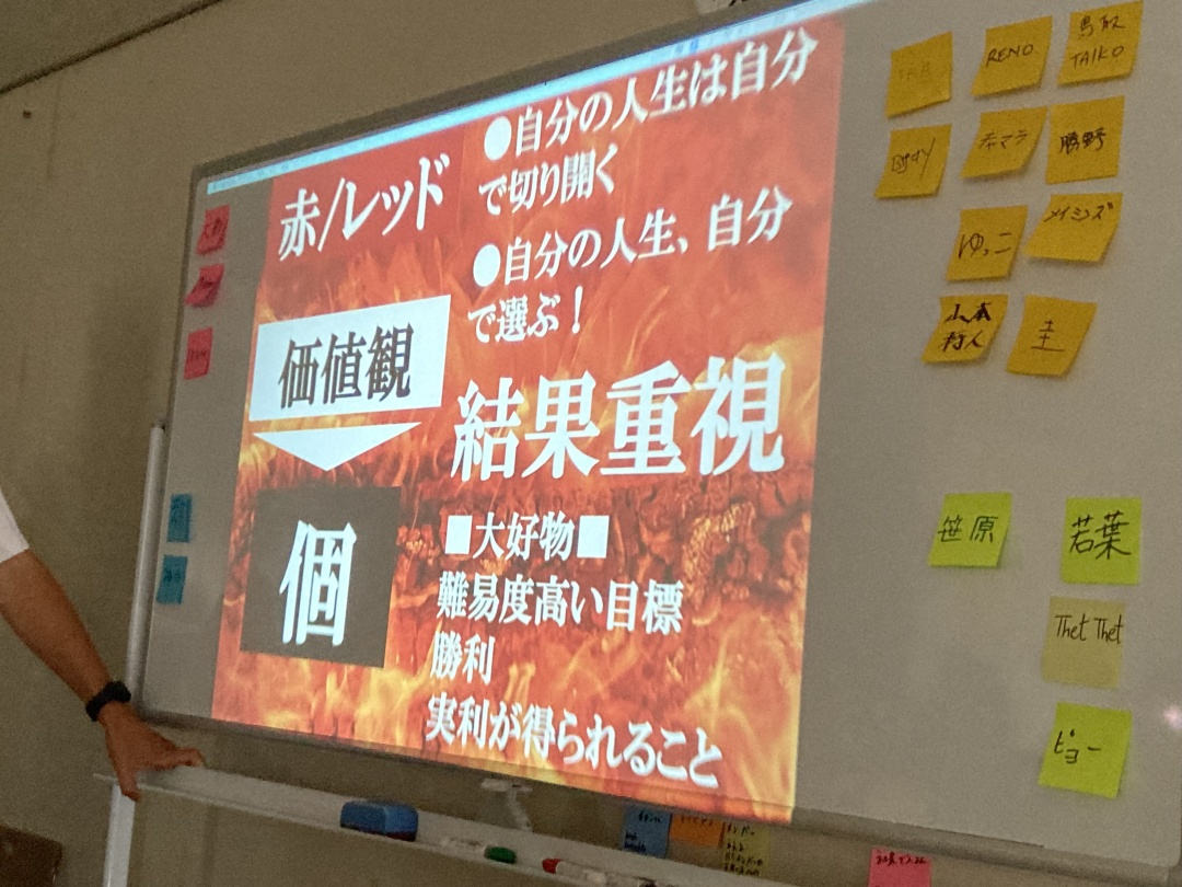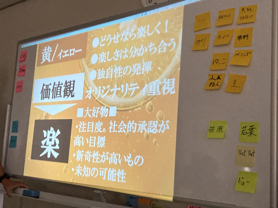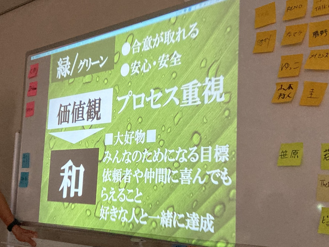 上記は一部ですが、このように、各色の特徴について解説が進んでいきました。各色の価値観、大好物、やる気のスイッチ、コミュニケーションのポイント、力を引き出す言葉、苦手なことや弱点、心を乱す言葉など、その色の人と一緒に働く上でどんなことに注意したらいいのか、どんなコミュニケーションが理想なのかについて学んでいきました。