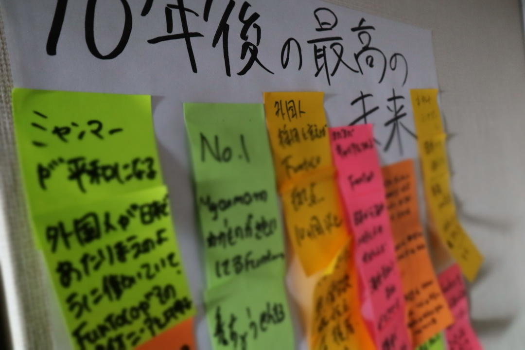 「10年後の最高の未来」では、どのグループもワクワクさせる回答ばかりが並んでいました。2日間の研修も、まもなく終了です。