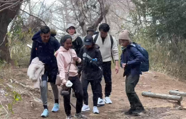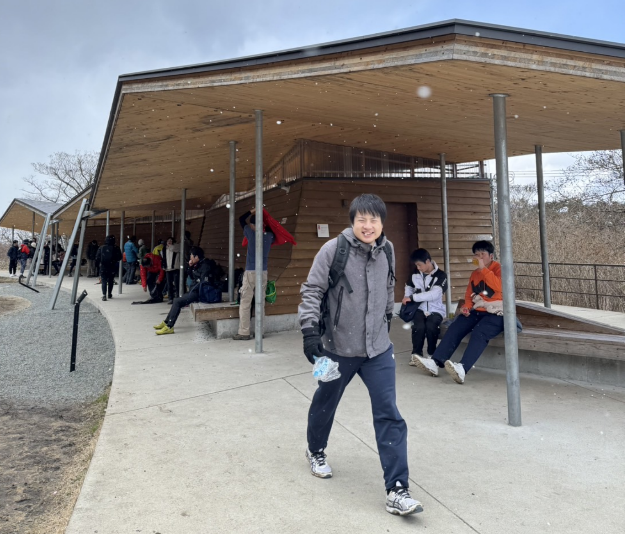 そして見えにくいかもしれないですが、途中で雪も降ってきました!当日の山頂付近の気温はー1度。山の気候は急に変わるので大変ですね。あたり一面が白くなりました。歩くのをやめると、一気に寒くなるので、ひたすら歩き続けます。