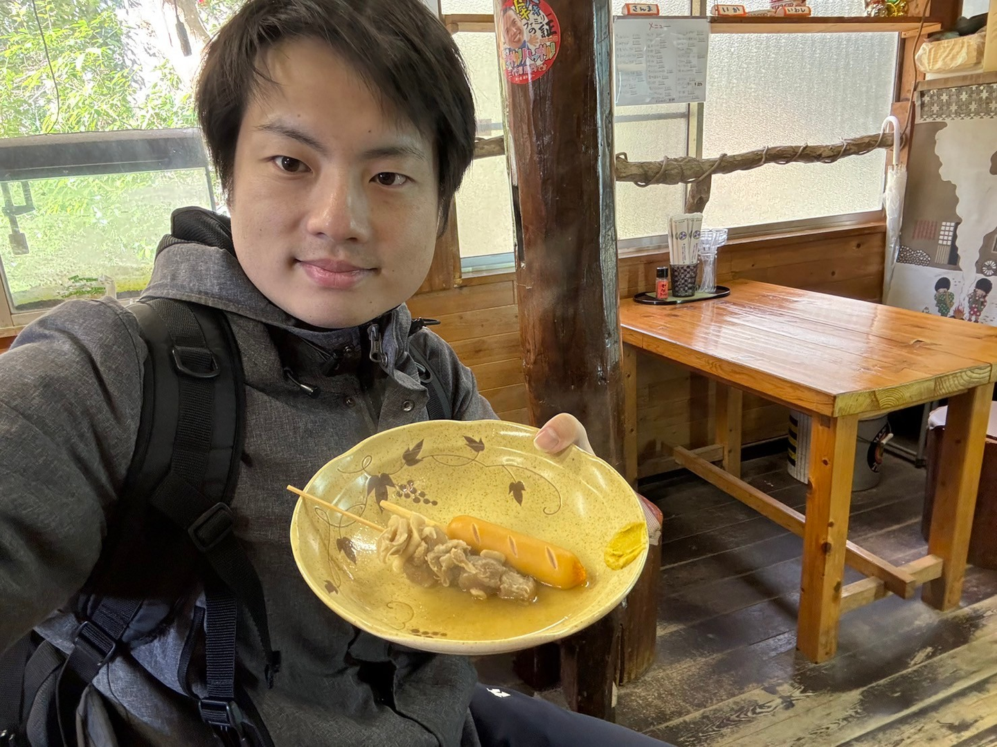 土日限定みたいですが、いざ山道に入る手前には、雰囲気のいい小さなお店があります。「おでん」が絶品ですので、ぜひ食べてみてください。トイレもしばらくないので、飲み物含めこのあたりでしっかり準備しておきましょう。
