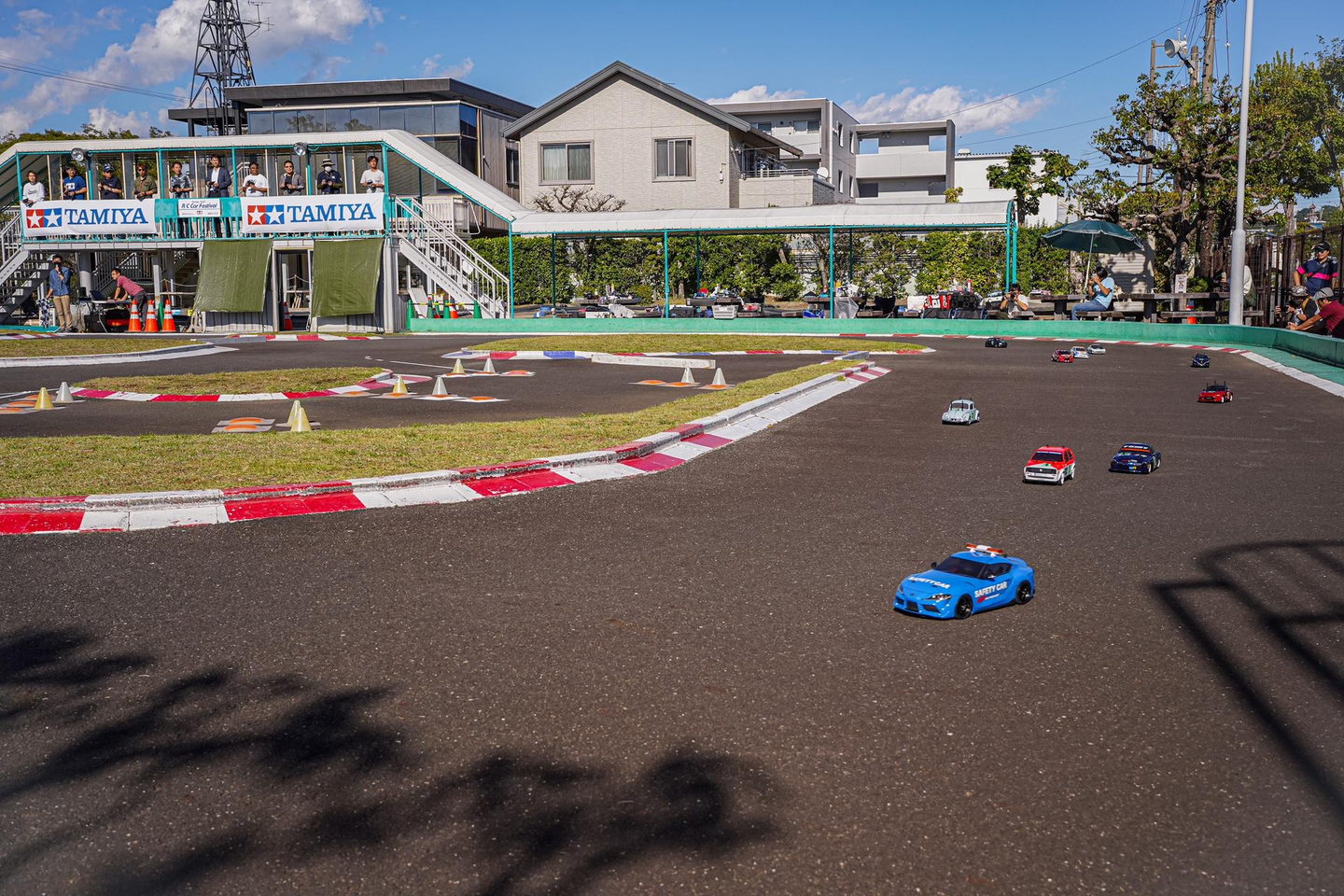 ▲社員向けイベントとは言え、そこは本物指向のタミヤ。実車レース同様、セーフティカー先導によるローリングスタートでレースが開始。