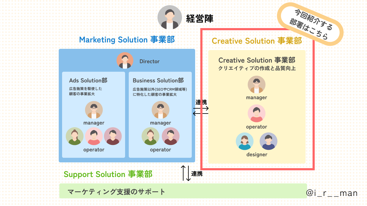 社内で「クリエイティブの制作に多くの時間を割いている」という課題があった時期に、「クリエイティブチームがあればもっと効率的に動けるのに」と話していたんです。