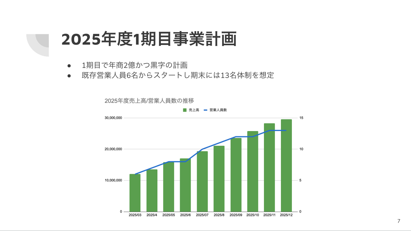 こちらにあるように、毎月売上は右肩上がりで伸ばしていく想定です(緑のグラフ)。私たちのビジネスモデルは労働集約型と呼ばれており、人が増えれば増えるほど売上が上がります(青のグラフ)。この計画を実現させるためには、とにかく「仲間」が必要です。現状の営業6名体制から期末で13名体制を計画しています!