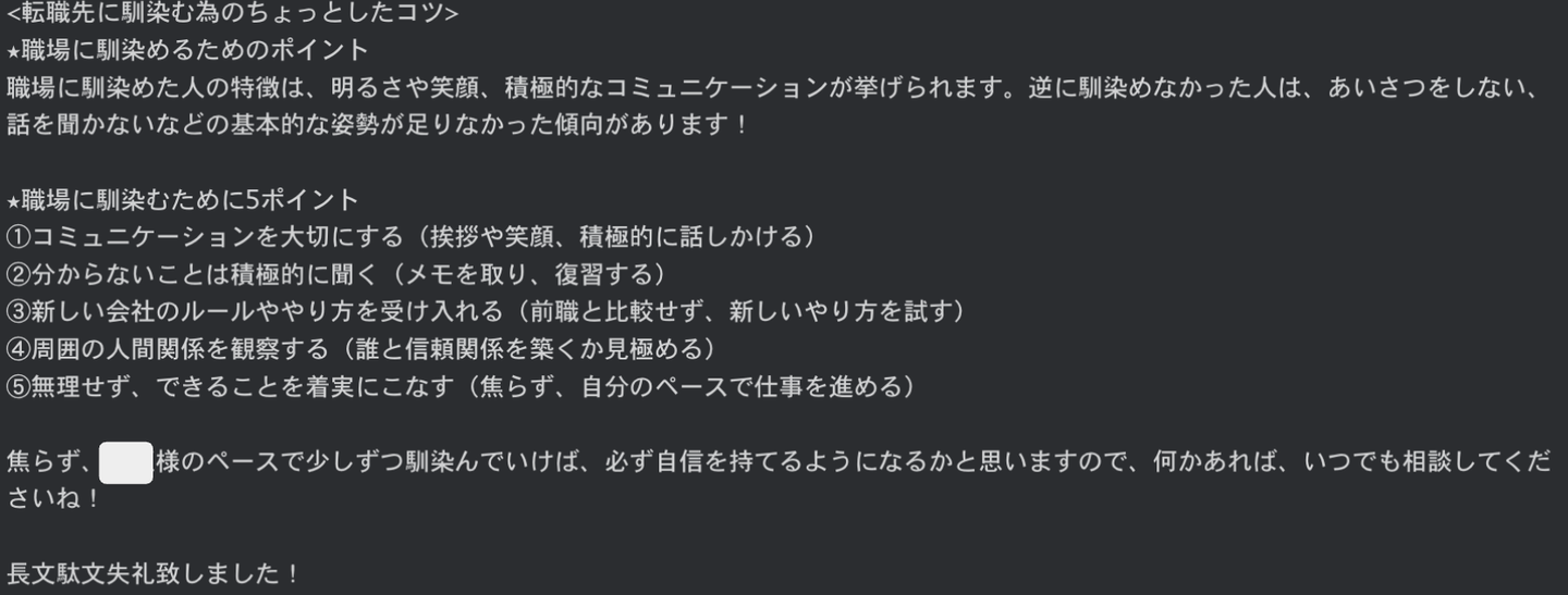 もちろん、求職者様もわかっていることかもしれないですが、馴染むためのポイントなどもお送りさせて頂いています。
